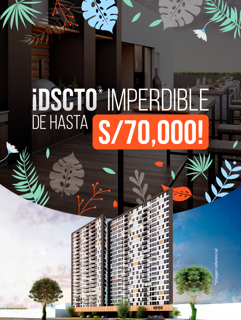 Sujeta a evaluación crediticia. No acumulable con otras promociones. Sólo aplicable para créditos hipotecarios tradicionales, no aplica para ahorros. El cliente puede firmar minuta con el 4% del valor del inmueble. El cliente deberá pagar por lo menos el 10% de la cuota inicial. La promoción el descuento máximo de hasta S/ 70,000. El descuento se aplicará sobre al precio de lista. El descuento varía según tipología. Promoción sujeta a cambios sin previo aviso. Para más información consultar en nuestra Sala de Ventas, ubicada en Av. República de Panamá 4077, Surquillo. DESARROLLO TANGUIS S.A.C., RUC 20601832161, en cumplimiento de la Ley N° 29571, se le informa que Ud. puede acceder de manera previa y gratuita a eres.grupolar.pe para obtener información y características del inmueble y proyecto inmobiliario de su interés, los antecedentes del proveedor, canales de atención de quejas, reclamos o denuncias, centrales y registro de sanciones a cargo del Indecopi y demás información relevante.